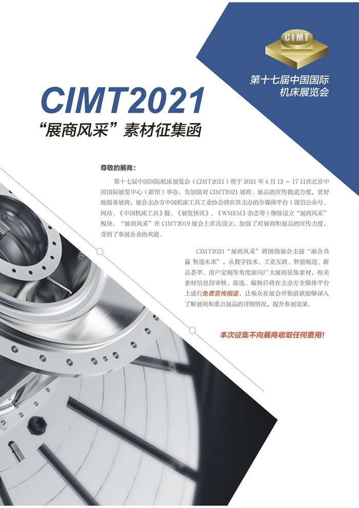 CIMT2021“展商風采”將圍繞展會主題“融合共贏 智造未來”,涵蓋數(shù)字技術(shù)、工業(yè)互聯(lián)、智能制造、新品薈萃、用戶定制等相關(guān)內(nèi)容,素材信息經(jīng)審核、篩選、編輯后公開發(fā)布。本次征集不向展商收取任何費用!