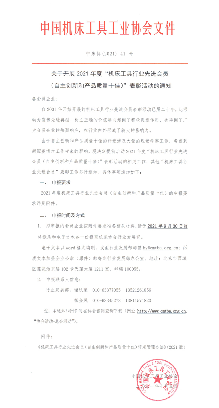 關(guān)于開展2021年度機(jī)床工具行業(yè)先進(jìn)會(huì)員(自主創(chuàng)新和產(chǎn)品質(zhì)量十佳)表彰活動(dòng)的通知