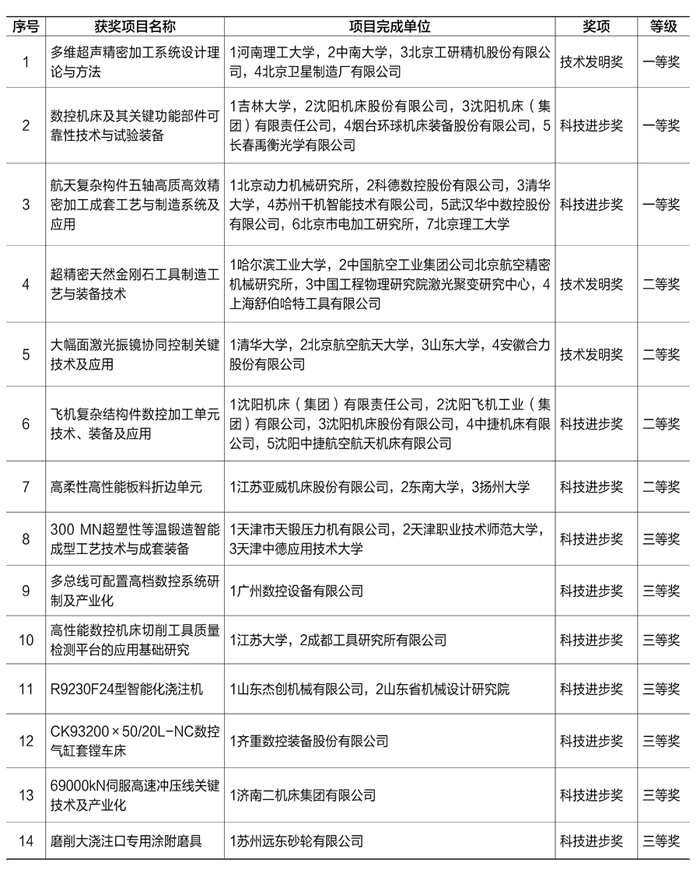日前,2021年度中國機械工業科學技術獎評獎公示期結束,業界人士注意到,公示的366項建議鼓勵的項目中,有14項由機床工具專業評審組評審推薦的項目獲獎(見下表),其中一等獎3項、二等獎4項、三等獎7項。這些項目均經中國機械工業科學技術獎評審委員會審核批準,申報單位確認。