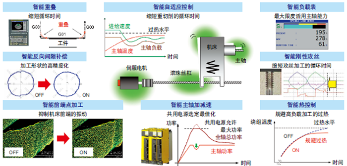 OKUMA公司的智能化技術,包含規則熱變形控制技術(Thermo-Friendly)、幾何誤差測量補償技術(5-AxisAuto Tuning System)、伺服導航技術(Servonavi)、防碰撞技術(Collision Avoidance System)和加工參數優化技術(Machining Navi)等功能。其中規則熱變形控制技術、幾何誤差測量補償技術、伺服導航技術三項功能主要用來提高和保持機床的精度;防碰撞技術用以保障機床設備的安全,加工參數優化技術用以優化切削參數,提高機床的加工效率。