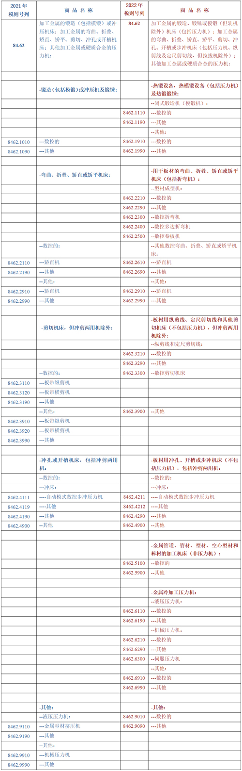 本次修訂是在國際海關組織對成形機床六位子目進行轉制的框架下完成的。主要是更加詳細界定了8462品目的金屬成形機床范圍,明確區分了冷熱加工工藝設備,并且根據技術發展和加工零件類別對稅則進一步細分,與2021年版相比,累計增列了12個八位商品稅則號列。