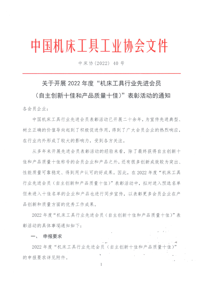 2022年度“機床工具行業先進會員(自主創新十佳和產品質量十佳)”表彰活動的具體事項詳見以下文件。請申報企業注意時間節點:2022年10月20日前 將申報材料報送至機床工具協會行業發展部。