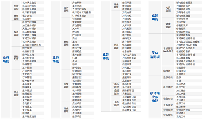 功能模塊:資源文件管理、刀具標準化管理、自動化產線監控、設備維保管理等。
