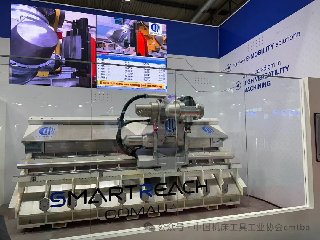 意大利COMAU公司在本屆展會推出全球首發Smart-Reach高速加工中心,機床采用一個直線軸和多個關節機械手的旋轉軸,以半圓柱形包絡面圍繞工件移動,具有五軸聯動加工功能,工件一次裝夾可實現六面加工。機床重復定位精度±0.003mm,X/Y/Z軸的快移速度為80/90/90m/min,加速度0.8g。適用于大型輕量化結構件的高效靈活加工,如大型鑄件底座、電池托盤、航空結構件等。