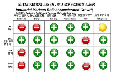 關于全球制造業(yè)加速發(fā)展的態(tài)勢,美國KENNAMETAL(肯納金屬)公司發(fā)表了一份調(diào)研材料(見圖2)。從圖2可以看出(綠色圓形符號表示加速增長),除了少數(shù)地區(qū)的部分行業(yè)以外,全球各大洲都呈現(xiàn)出制造業(yè)普遍加速增長的態(tài)勢。肯納公司的調(diào)研還顯示,東歐、韓國、拉丁美洲、印度、中國等新興市場的需求將會更快增長。