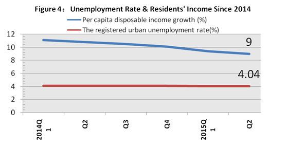 Figure 4 is the situation of China's employment rate and household income since last year. As seen in the figure, although the economy further slowed down in the first half of this year, the employment rate remained stable. In the first half of this year, the actual increase in employment was 7.18 million people, which is 72% of the annual target. It can also be seen from the figure, although the growth rate of disposal income per capita shows a downward trend, at the end of the second quarter this year, the data is still up to 9%, continuing to be higher than the GDP growth rate (7%) in the same period. Ensuring employment and income growth are the basic starting point and foothold of economic development. Therefore, it is one of the bottom lines of macro adjustment and control of China's economy. Despite a further slowdown in the GDP growth, the good performance of the employment and income growth have provided enough support for China's comprehensive economic reform and economic structural adjustment.