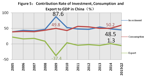 Please look at another group of data. Figure 5 is the contribution of investment, consumption and exports to the GDP growth in 10 years. It can be seen that before 2008 China's economic growth was jointly pulled by "three-in-hand" for investment, consumption and export and their contribution to the GDP growth basically maintained balance; in 2009, due to the global financial crisis and the effect of China's massive stimulus plan, the economic growth driving force experienced serious structural imbalance. The contribution of investment to economic growth reached a record 87.6%! While the contribution of exports to economic growth has reached a record of minus 37.4%! Since 2010, China's economic growth was in fact pulled by "two-horse-carriages" of investment and consumption, due to influences of multiple factors that the global market demand dropped significantly and China's export competitiveness weakened and etc....We've particularly noted that consumption has replaced investment becoming the first driving force for economic growth in China since 2011. In the first half of this year, the number has reached 60%! This is not the case for a long time, while this situation is the main pursuant goal of China's economic structural adjustment, which is to achieve the economic growth model mainly relying on consumption drive.