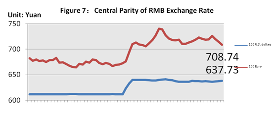 Now come to the foreign exchange market. On August 11th, China's central bank announced the reform of quotation mechanism of the foreign exchange parity of the RMB and U.S. dollar, which started a new round of exchange rate reform in china. In that time, the RMB exchange rate faced a great depreciation pressure, but now it has gradually stabilized. On September 17th, the State Administration of Foreign Exchange announced the pressure of the depreciation of the RMB has basically released, which marked the new reform had come to an end. Figure 7 is the changes of middle rate of RMB against U.S. dollar exchange rate in the third quarter of this year, which also shows the RMB exchange rate against the euro.