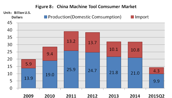 On the basic characteristics of changes of China's machine tool consumer market, we want to do the following explanation: first, because the most significant market demand decline is the low -end homogeneity products and most of which are manufactured by enterprises at home. Therefore, China's machine tool manufacturing industry has experienced a greater impact and influence. Relatively speaking, the influence on imported machine tools is weaker. Especially due to the upgrade of the market demand structure, the comparative advantage of imported machine tools has been correspondingly expanded. Second, although the total demand of China's machine tool consumer market is declining, China is still the world's largest machine tool consumer, the largest machine tool importer and the major force of international trade. In 2014 China's total machine tool consumption reached USD31.8 billion, accounting for 42.1% of total global consumption. The machine tool imports reached USD10.8 billion, accounting for 29.8% of the world total. The total amount of machine tool trade reached USD14.2 billion, accounting for 18.1% of total global trade. Finally, China's machine tool consumer market demand decline is a periodical phenomenon. In a sense, this is a reasonable price having to be paid for the implementation of the economic structure adjustment. With the continuous deepening of China's economic structure adjustment, the long-term growth potential of China's machine tool consumer market will be effectively released. Although China's economic aggregate has been very large, China is still a developing country. China's new model of industrialization, informatization, urbanization and agricultural modernization still has a long way to go, which means that China's machine tool consumer market has also a long-term growth potential and tremendous growth space.