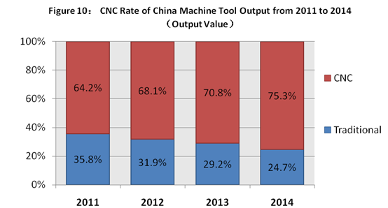 Under the influence of the global economic rebalancing, especially of China's economic structural adjustment and growth slowdown, China's machine tool consumer market has changed significantly in recent years. The basic characteristics of the changes are in the two aspects. On one hand, the total market demand is significantly reduced, of which the demand for low-end homogeneous products and heavy duty machine tool products declined particularly prominent. Figure 8 reflects the above trend. On the other hand, the market demand structure shows a rapid upgrade. The main direction of the upgrade is the automatic complete set, customization and general shift to the upgrade (Figure 9). Among them, the market demand growth for automatic complete sets of equipment is particularly significant, which origins not only from the users need of upgrade of China's machine tool, but also from a significant changes of the rapid increase in China's labor costs and labor supply and demand relation. Figure 10 shows the numerical control rate of output of China's machine tool manufacturing in recent years (calculated by output value). It can be seen in the 4 years when the total demand quantity of China's machine tool consumer market has been significantly reduced, the numerical control rate of China's machine tool manufacturing output is in rapid optimization. Compared with 2011, the data increased by 11.1 percentage points in 2014, which from one side reflects the characteristic of general shift to upgrade in China's machine tool market.