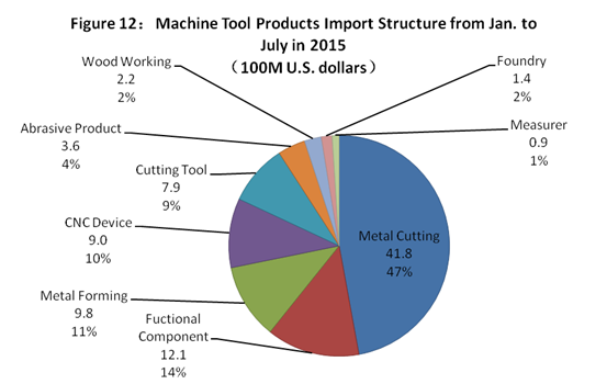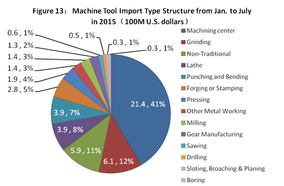 Figure 13 is the distribution situation of imported machine tools by categories. The data shows that the sequence of categories with larger import values are the machining center, grinder, non-traditional machine tool, lathes and punching shear machine tool. The total import amount of the five categories of machine tool was USD 4.11 billion, accounting for 79.9%.