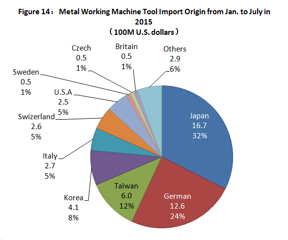 Figure 14 is the distribution situation of imported machine tools by origin. The data shows the sequence of countries and regions with larger import amount by China are Japan, Germany, Taiwan, South Korea and Italy. The total amount of imports from countries and region above mentioned by China reached 4.21 billion USD accounting for 81.6%.