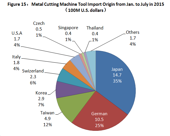 Figure 15 is the distribution situation of imported metal cutting machine tools by origins. The data shows the sequence of countries and regions with larger import amount by China are Japan, Germany, Taiwan, South Korea and Switzerland. The total amount of imports from the said countries and region reached USD 3.53billion, accounting for 84.4%.