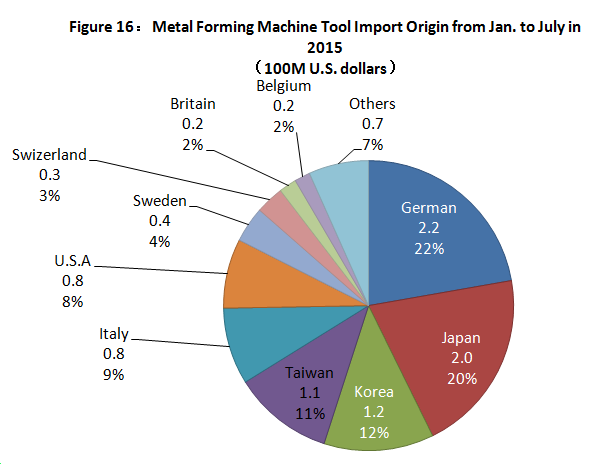 Figure 16 is the distribution situation of the origins of the metal forming machine tool imported. The data shows the sequence of countries and regions with larger import amount by China are Germany, Japan, South Korea, Taiwan and Italy. The total import amount from the said countries and region by China reached USD 730 million, accounting for 74.5%.